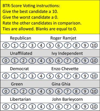 It’s easy, give your favorite candidate a top score of 10, give the worst a 0, rate the other candidates in comparison. Ties are allowed even for best and worst.